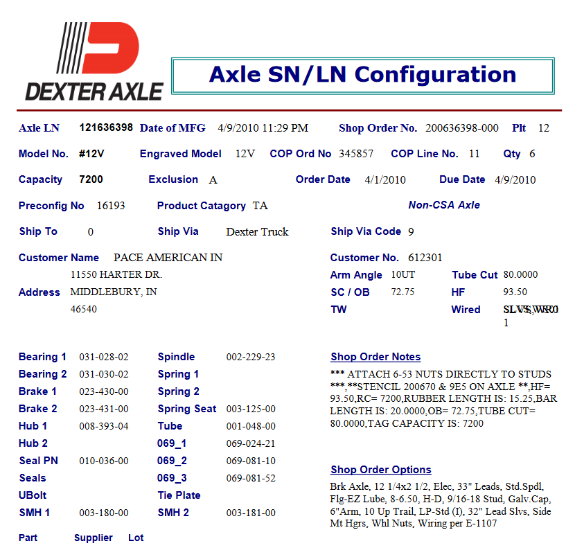 12VTF 7.2K 865 ELEC 9/16;STUD Build Per serial number attached